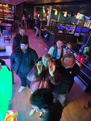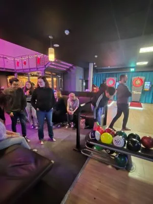 und Musiker auf den Weg zu einem besonderen Übungserlebnis: Bowlen stand auf dem Programm.