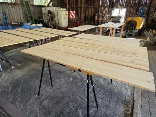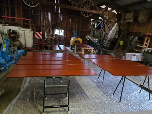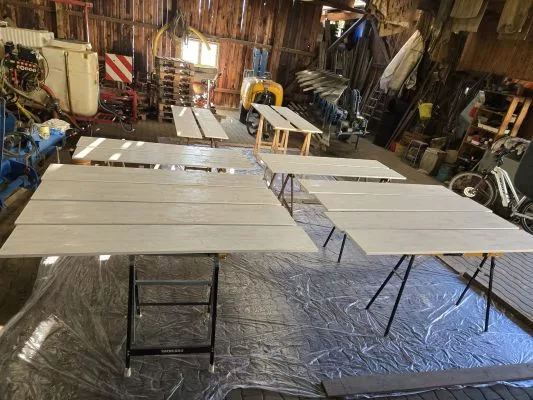 Mit viel Herzblut wurden die Holztafeln von einem Vorstandsmitglied geölt, grundiert und gestrichen. Diese Arbeiten incl. den erforderlichen Trocknungsphasen konnten wir bei unserem aktiven Mitglied Familie Heinrich Rupp in seiner Scheune wetterunabhängig durchführen. Auch Dir liebe Wally und Heiner ein herzliches Dankeschön!